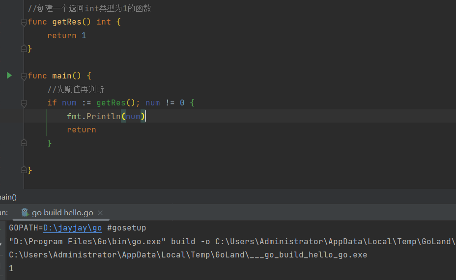 getRes() 是一个带有返回值的函数,它,num := getRes() 是一个语句,执行 getRes() 函数后,将返回值赋值给 num 变量。